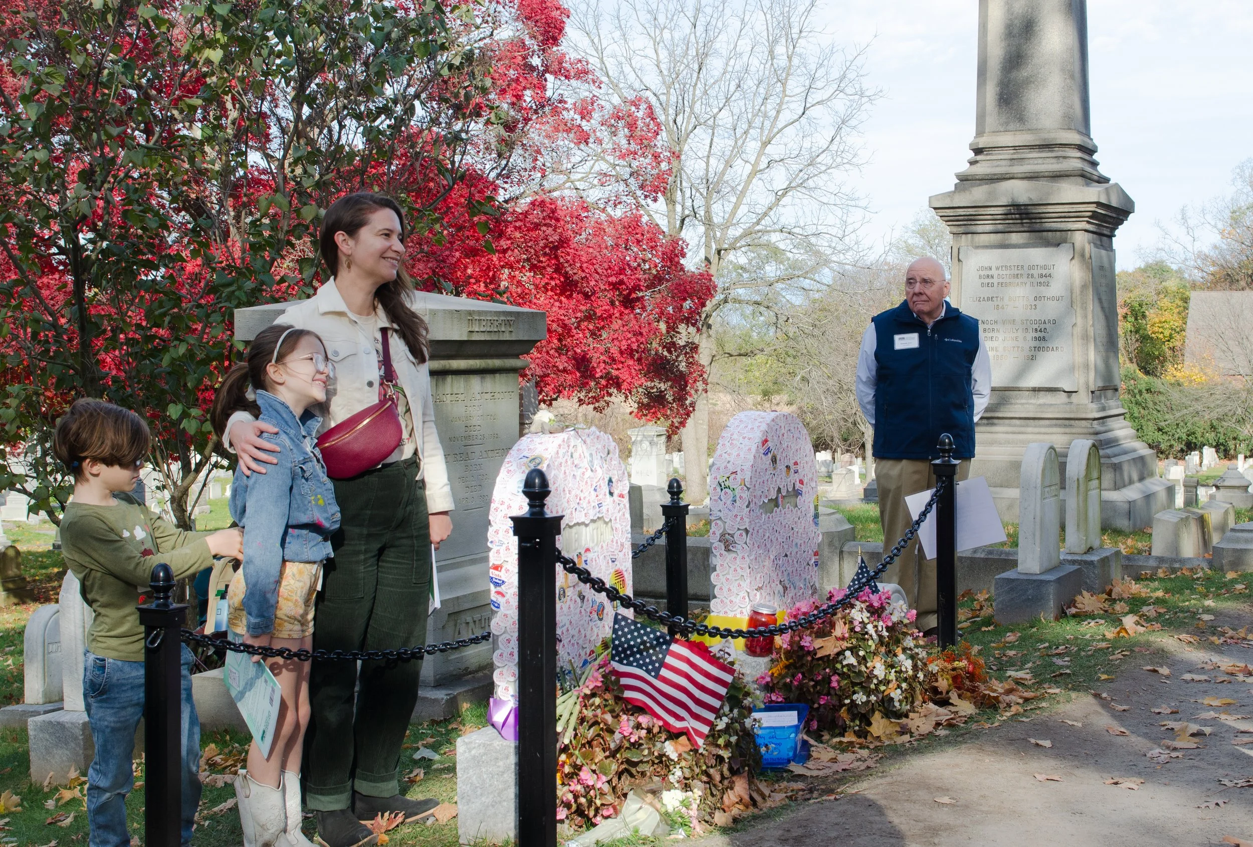 On Election Day, Nov. 5, 2024, voters place their "I Voted" stickers on woman suffragist Susan B. Anthony's headstone in Rochester, NY.