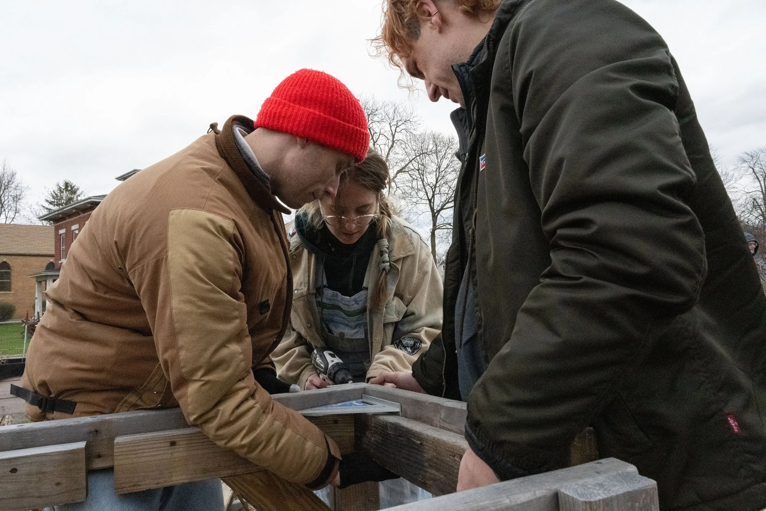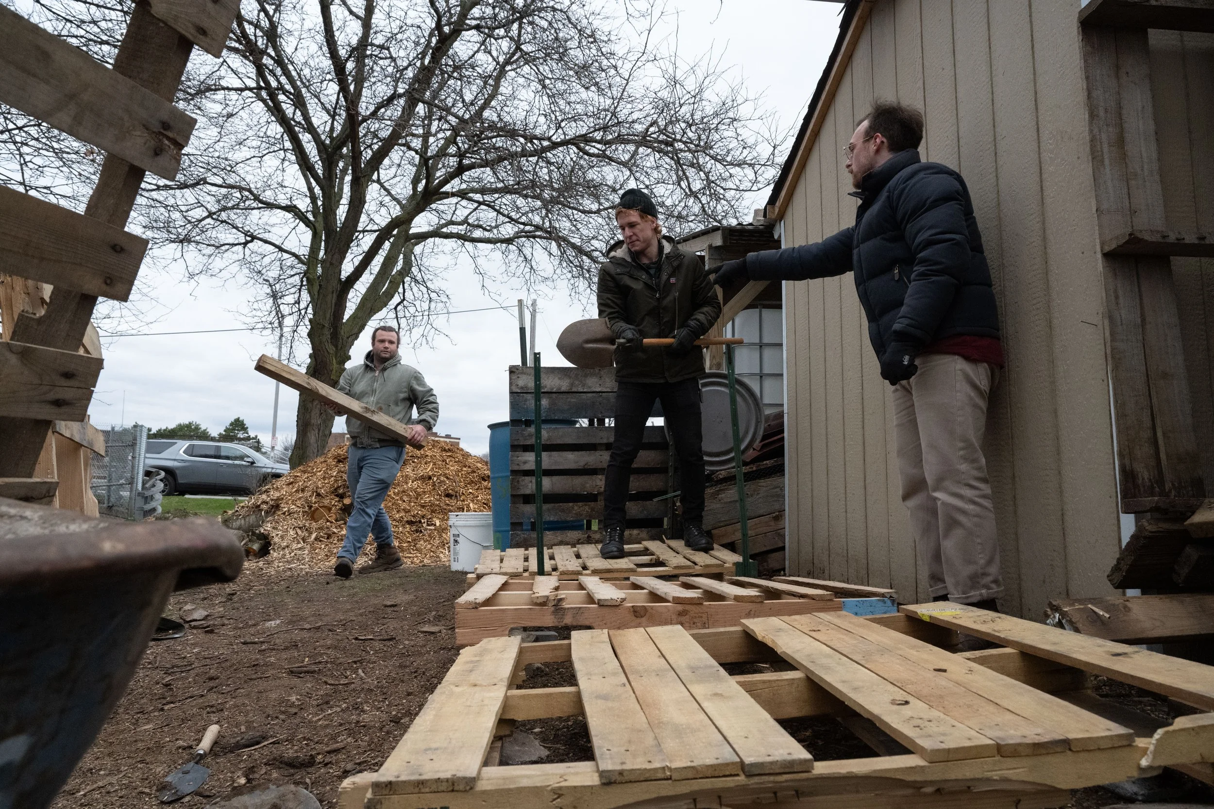Timothy Dunn (left), Chloe Smith (middle), and a volunteer (right) dig up compost on the first volunteer night at 490 Farm, Monday, April 15, 2024, in Rochester, N.Y.